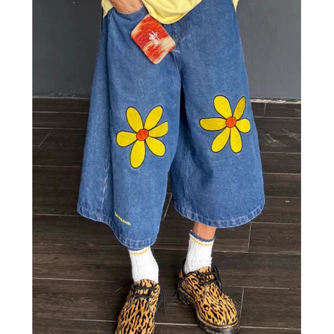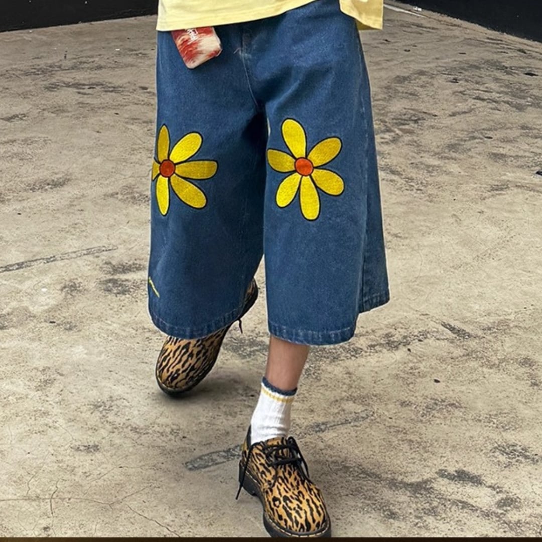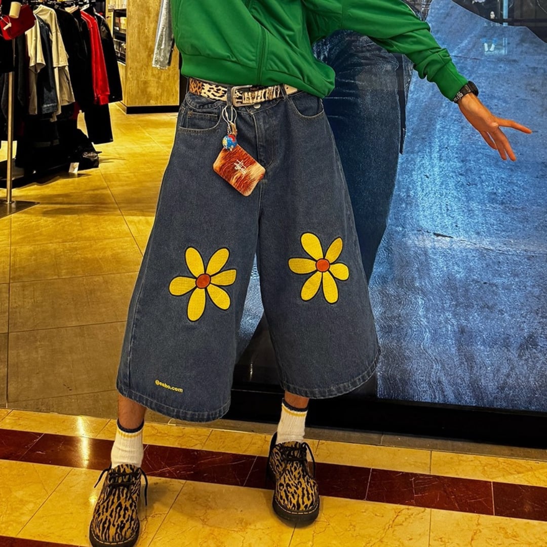 Floral Embroidered Denim Shorts | Unisex Straight-Leg Wide Casual 3/4-Length Jeans (FD005)
