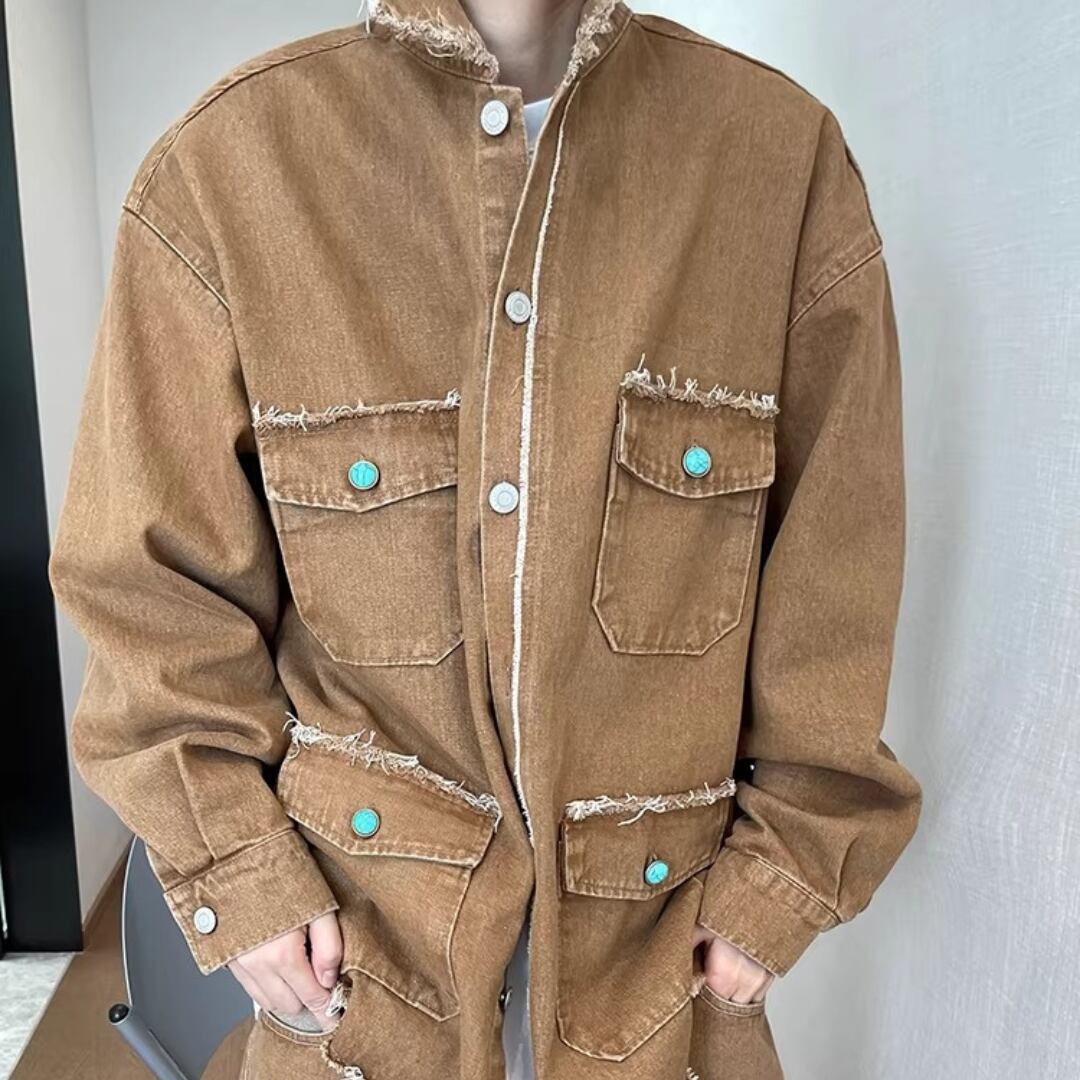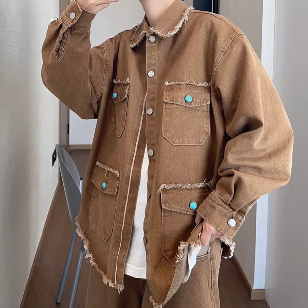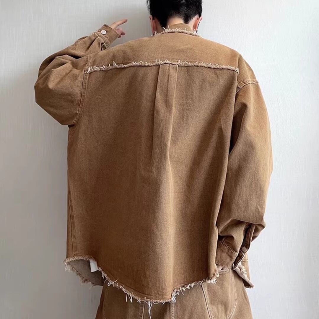 Vintage Heavyweight Khaki Multi-Pocket Raw-Edge Workwear Denim Jacket (FD069)
